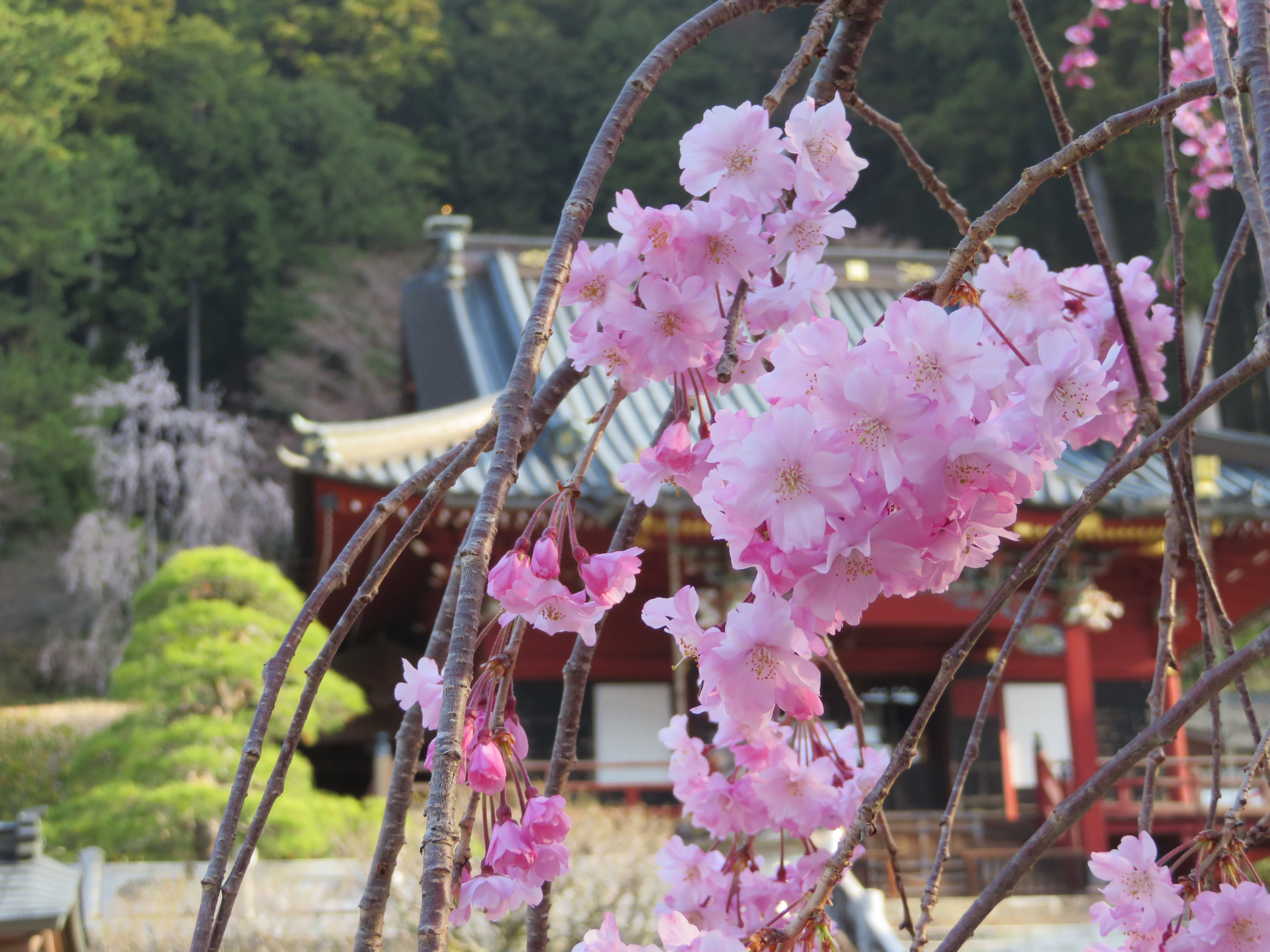 境内の紅しだれ桜もたくさん花が開いてきました。
